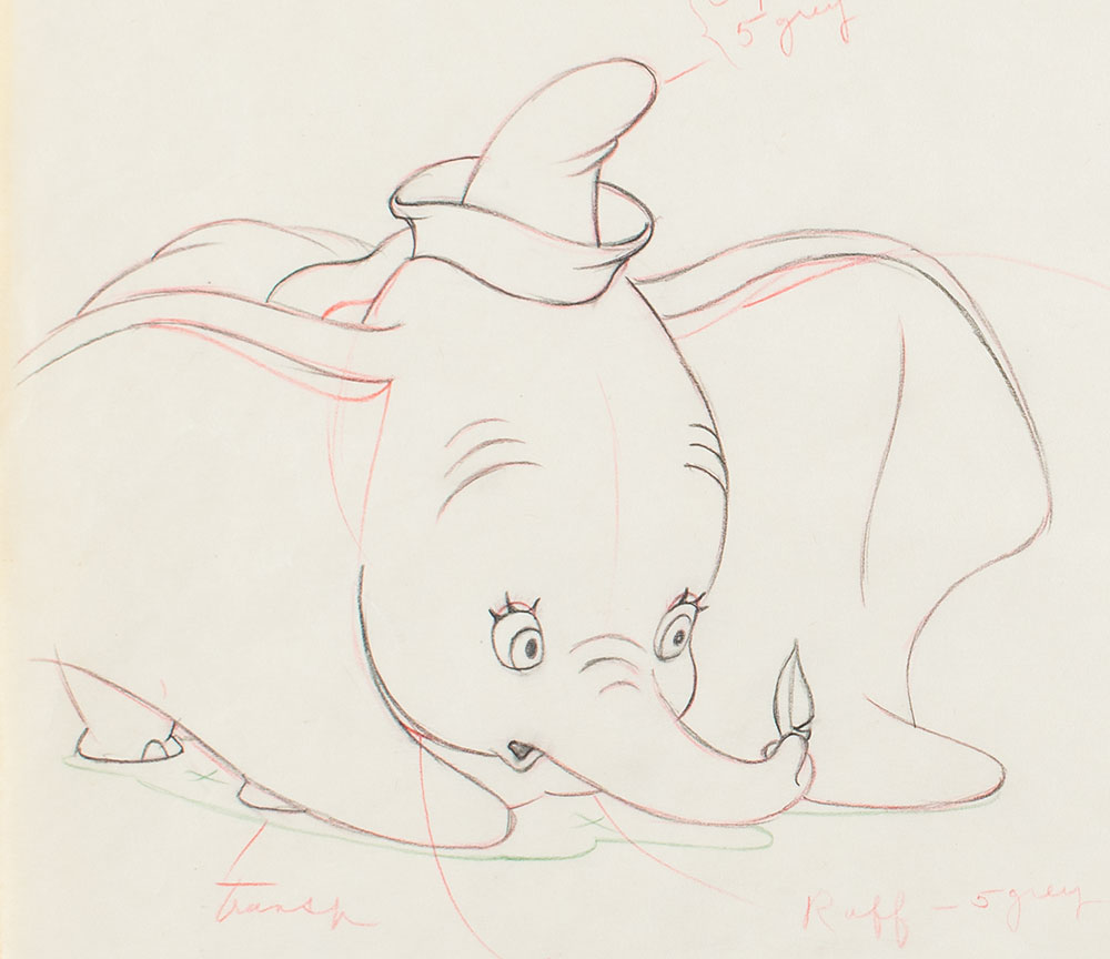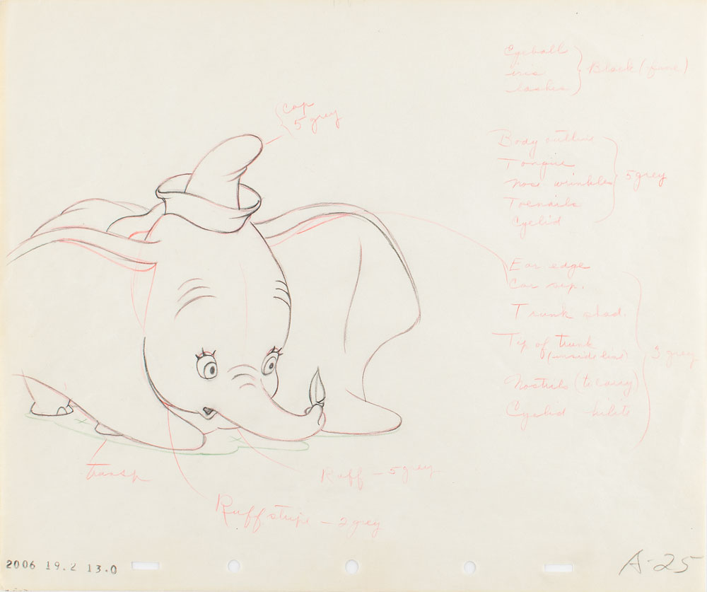 (Walt Disney Studios, 1941) Original production drawing featuring the big-eared Dumbo from Dumbo, boasting numerous annotations associated with the black and gray colors to be used for character. Accomplished in graphite and colored pencil on untrimmed 12 x 10 animation paper, stamped along the bottom, "2006 19.2 13.0" and marked "A-25" in the lower right corner. Image measures 7 x 5.5. In fine condition.