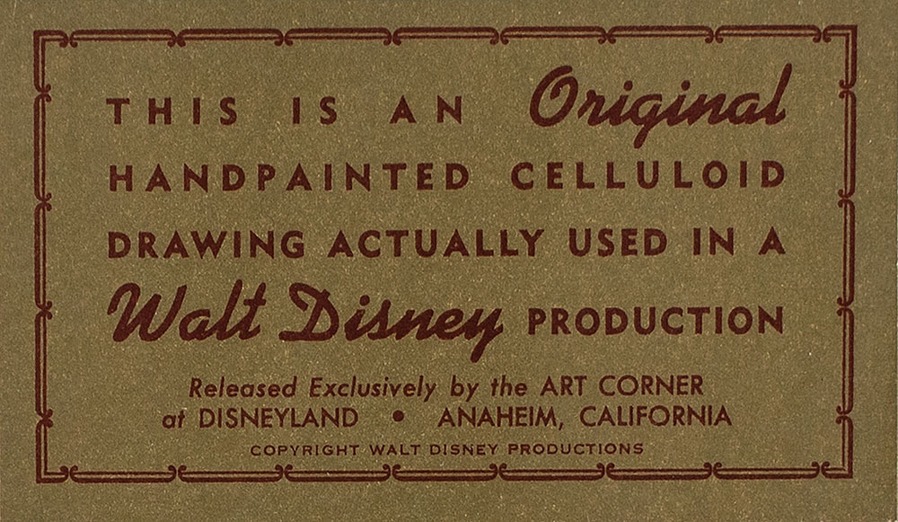 (Walt Disney Studios) Original production cel featuring Chip 'n' Dale from an unknown Disney cartoon, showing the playful chipmunk brothers side-by-side. The cel is placed on a Disney litho background. Chip measures 2 x 3.25 and Dale measures 3 x 3.5, with a mat opening of 10 x 8. Matted to an overall size of 14 x 11. Reverse bears a gold label certifying the piece as an "original handpainted celluloid drawing actually used in a Walt Disney production, released exclusively by the Art Corner at Disneyland." In fine condition.
