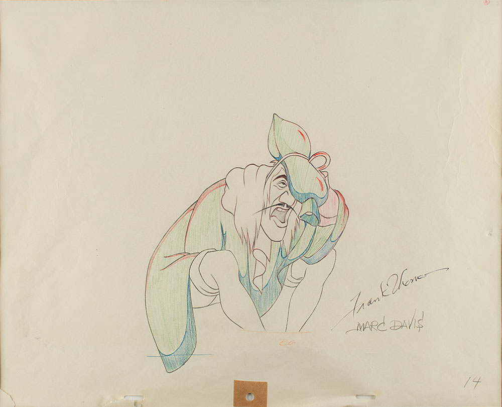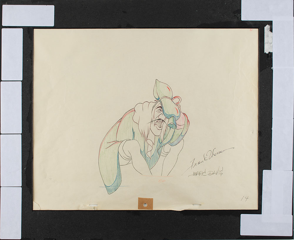 (Walt Disney Studios, 1953) Original production drawing featuring Captain Hook from Peter Pan, signed in the lower right in pencil, "Marc Davis," and in ink, "Frank Thomas." The large image shows Captain Hook recovering with an ice pack on his forehead. Accomplished in graphite and colored pencil on 15.5 x 12.5 animation paper, marked "14" in the lower right. Image measures 6.25 x 7.5. In fine condition, with a few tears along the bottom edge.