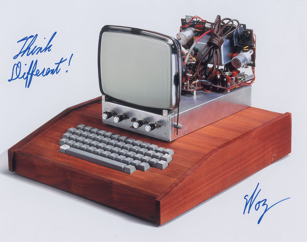 Color glossy 14 x 11 photo of an Apple-1 computer, signed in blue felt tip, "Think Different! Woz." In very fine condition.