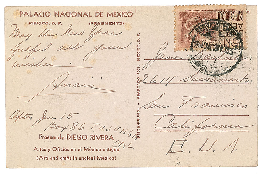Modernist writer (1903-1977) whose sexually explicit journals and correspondence with Henry Miller led to her popular resurgence in the 1970s as a feminist icon and a literary figure of the avant-garde. ALS signed “Anais,” penned on the reverse of a 5.5 x 3.5 National Palace of Mexico postcard showing a fresco by Diego Rivera, no date. A brief letter to Jane Kastner, in full: "May the New Year fulfil [sic] all your wishes," with Nin adding her address below, "After Jan 15, Box 86 Tujunga, Cal." In fine condition, with some faint foxing.