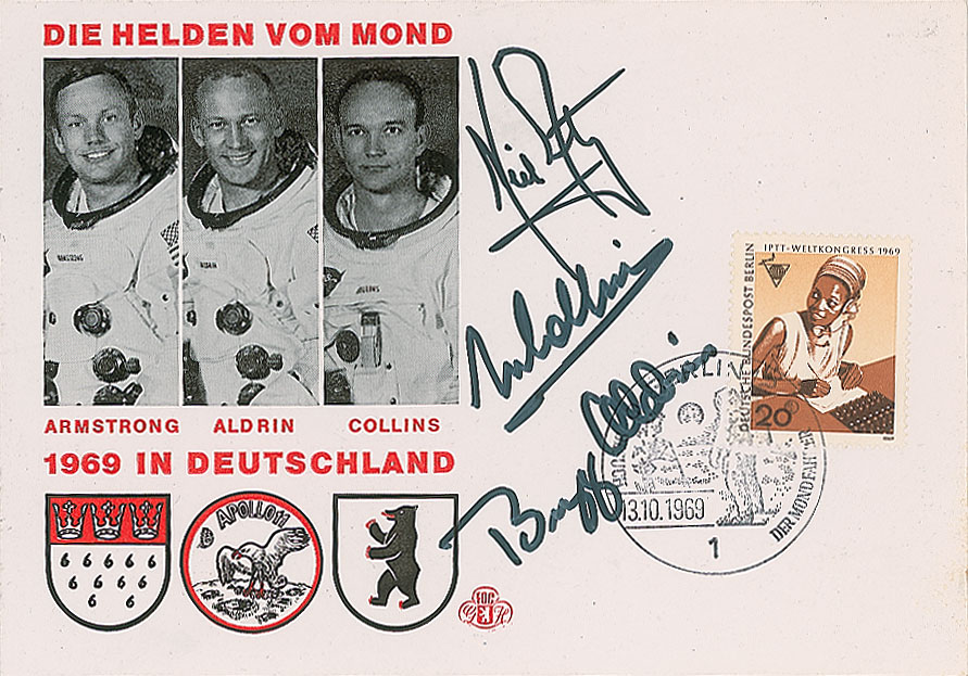 Attractive color glossy 5.75 x 4 German postcard honoring the Apollo 11 astronauts, with upper red text (translated) "The Heroes of the Moon," postmarked in Berlin on October 13, 1969, signed in black felt tip, "Neil Armstrong," "M. Collins," and "Buzz Aldrin." In fine condition.