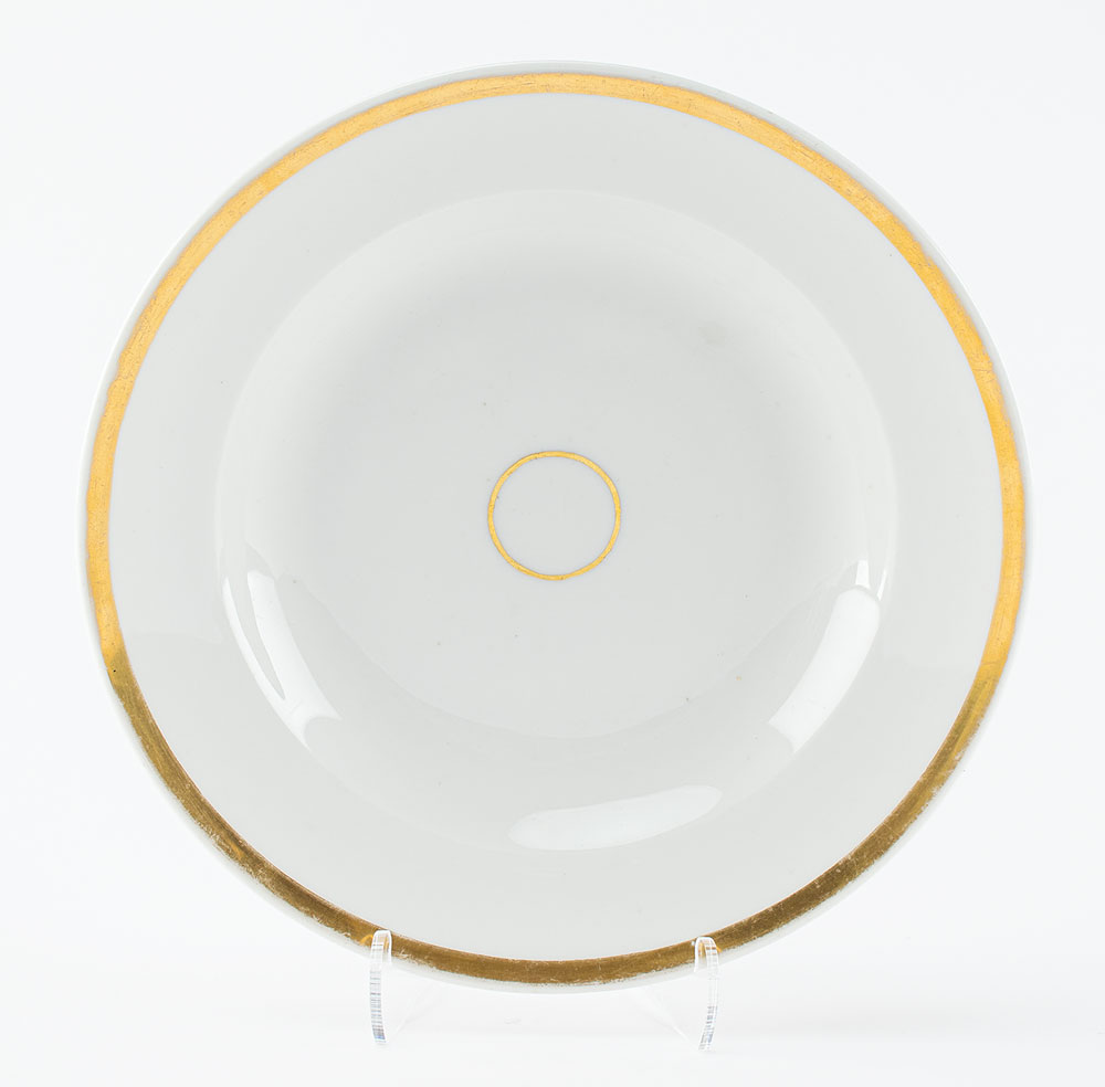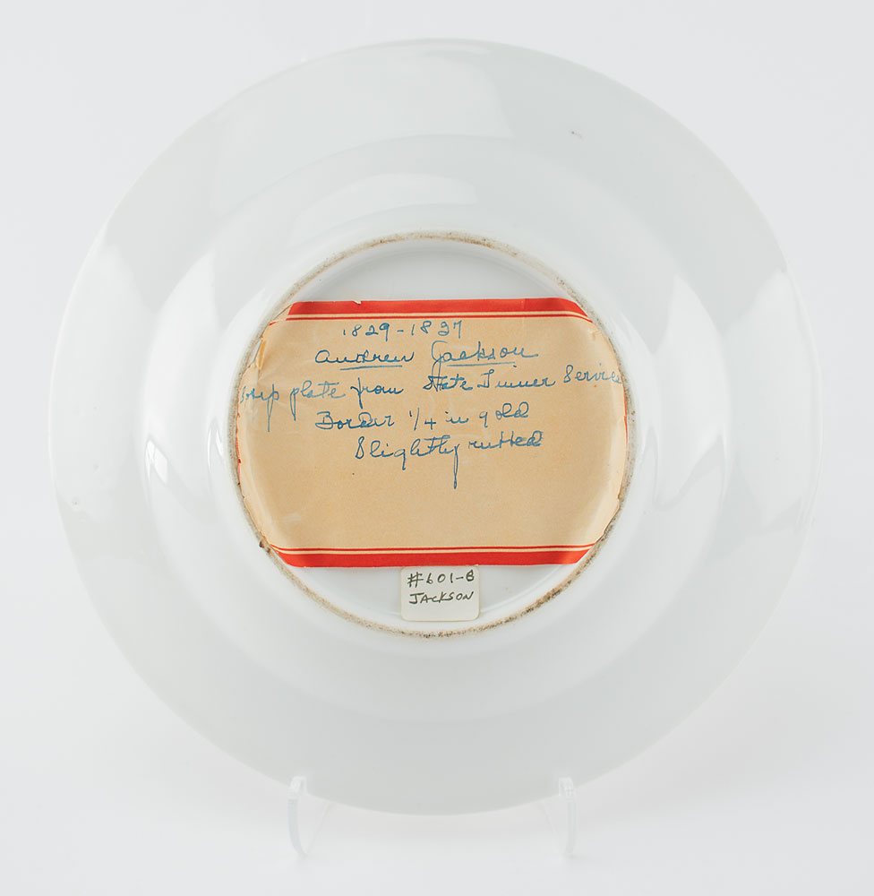 Appealing official White House china plate from the administration of President Andrew Jackson, measuring 9″ in diameter, featuring two concentric circles in gold. The bottom bears an old Dennison paper label that reads: “1829-1837, Andrew Jackson, Soup plate from State Dinner Service, Border 1/4 in gold, Slightly rubbed." In fine condition, with expected signs of use.