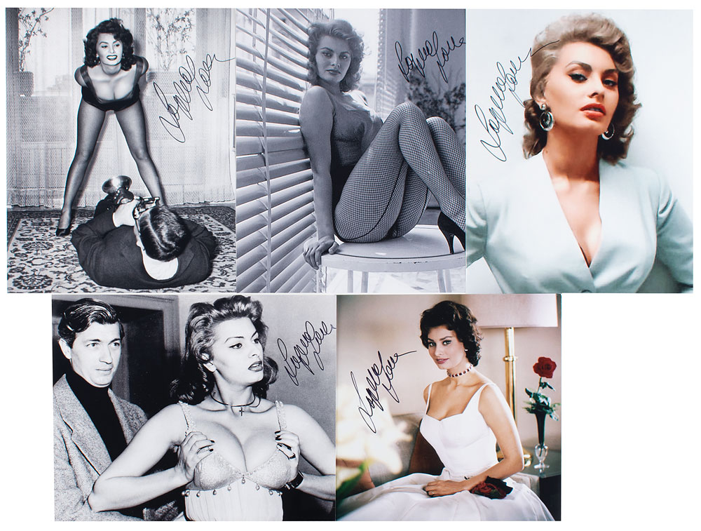 Group of five glossy photos of the sultry Sophia Loren, ranging in size from 8 x 8 to 10 x 8, each signed in black felt tip by the buxom Italian actress. In overall fine condition.