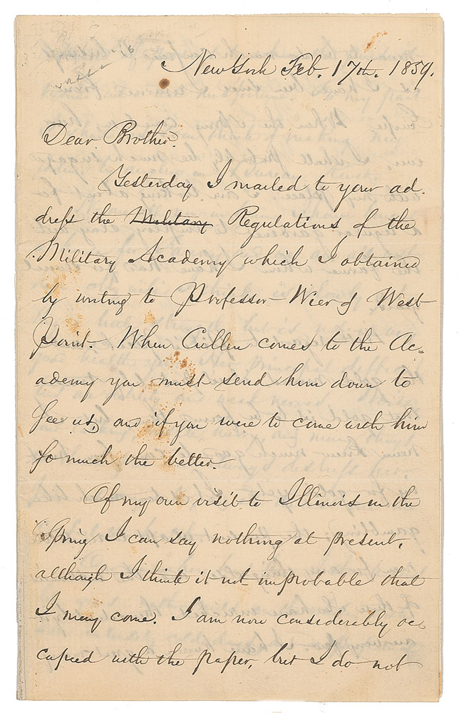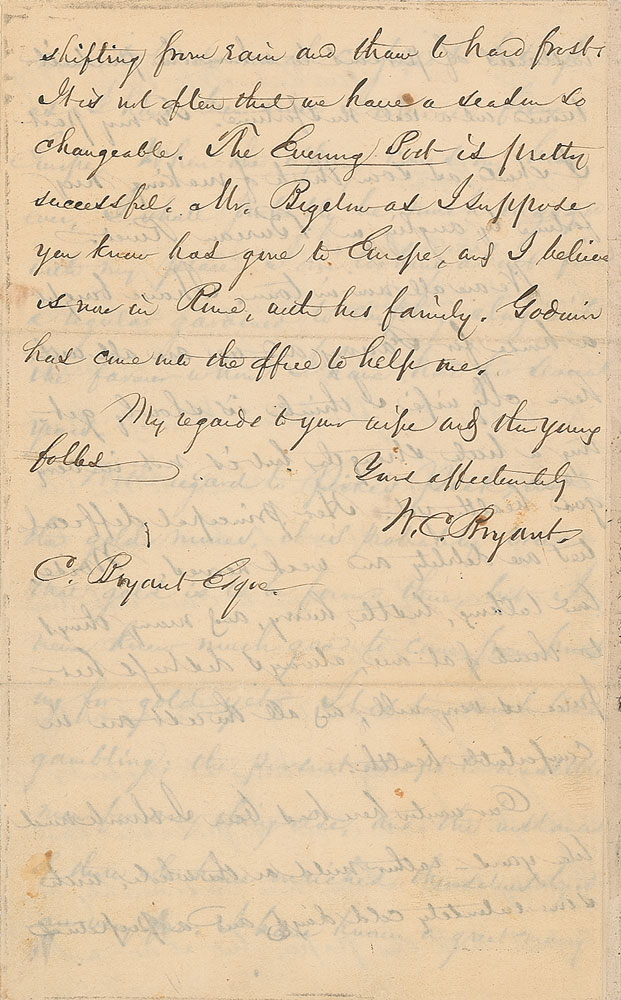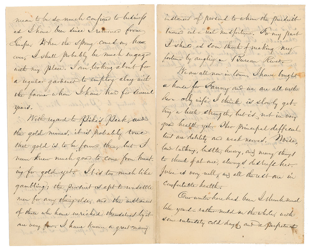 ALS signed “W. C. Bryant,” four pages on two adjoining sheets, 5 x 8, February 17, 1859. Letter to his brother Cyrus Bryant, in part: "Yesterday I mailed to your address the Military Regulations of the Military Academy which I obtained by writing to Professor Wier of West Point. When Cullen comes to the Academy you must send him down to see us, and if you were to come with him so much the better. Of my own visit to Illinois in the spring I can say nothing at present, although I think it not improbable that I may come. I am now considerably occupied with the paper, but I do not mean to be so much confined to business as I have been since I returned from Europe. When the spring comes on, however, I shall probably be much engaged with my place. I am looking about for a regular gardener to employ along with the farmer whom I have had for several years. With regard to Pike's Peak and the gold mines, it is probably true that gold is to be found there, but I never knew much good to come from hunting for gold yet. It is too much like gambling; the pursuit is apt to unsettle men for anything else, and the instances of those who have enriched themselves by it are very few. I have known a great many instance of persons to whom the pursuit turned into a real misfortune. For my part I shall as soon think of making my fortune by angling in Bureau River." In fine condition, with scattered small stains, and separation along the hinge.