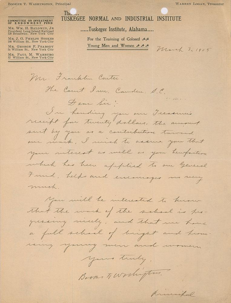 LS signed “Booker T. Washington, Principal,” one page, 8 x 10.5, Tuskegee Normal & Industrial Institute letterhead, March 3, 1905. Letter to Franklin Carter, in full: "In handing you our Treasurer's receipt for twenty dollars, the amount sent by you as a contribution toward our mark, I wish to assure you that your interest as well as your benefaction which has been applied to our General Fund, helps ad encourages us very much. You will be interested to know that the work of the school is progressing nicely, and that we have a full school of bright and promising young men and women." In fine condition, with light toning, and a small crease to the upper right corner. The recipient, Franklin Carter (1837-1919), was an American professor of Germanic and romance languages and served as President of Williams College from 1881 to 1901.
