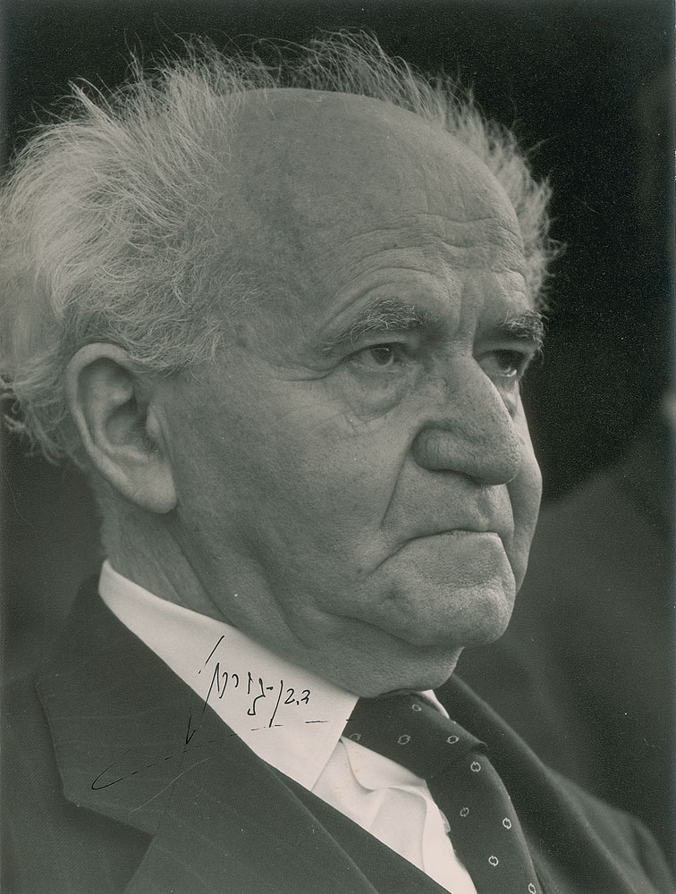Matte-finish 7 x 9.5 close-up photo of David Ben-Gurion, signed in Hebrew in black ink. Reverse bears a David Rubinger credit stamp. In fine condition.