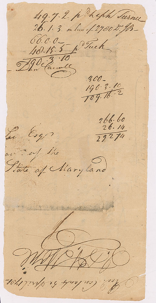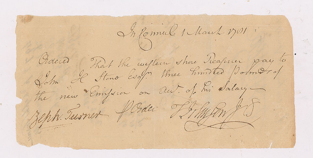 Revolutionary War-dated manuscript DS, signed by prominent patriots “T. Johnson,” “Dan Carroll,” and “J. H. Stone,” one page both sides, 7 x 3.5, March 1, 1781. Pay order issued to John H. Stone, Esq., for "three hundred Pounds… on acct. of his salary.” Signed at the conclusion by Johnson, and signed on the reverse by Stone and Carroll. In very good to fine condition, with several vertical folds, and some small edge chips.