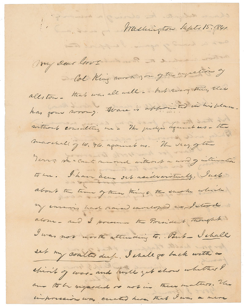 American politician and attorney (1810-1886) who was the first person of Jewish ancestry to be elected and serve as a United States Senator. ALS signed “D. Levy,” one page both sides, 8 x 10, September 15, 1841. Letter to Governor John Branch, with good political content. In part: ”Col. King wrote you of the rejection of Allston—that was all well—but everything else has gone wrong. [William H.] Ware is appointed in his place without consulting me. The Judges against us—the Marshall of W[est] F[lorida] Co. against us. The Secy. of the Territory Mr. [Joseph] McCants removed without a word of intimation to me. I have been set aside virtually. Just about the time of these things the smoke which my enemies had raised enveloped me, I stood alone. And I presume the President thought I was not worth attending to. But—I shall set my coulter deep. I shall go back with a spirit of war and will yet show whether I am to be regarded or not in these matters. The impression was created here that I was a mere chance delegate. The choice of a minority only- and that I will lose my seat and not be heard of again. I suppose this notion reached the President. I am mortified to be obliged to write you this, but so it is. Genl. [Samuel] Parkhill is dead. I don’t know but that the very fact of my having recommended Baily will prevent his appointment… will start South and spend a day or two with you." In fine condition.