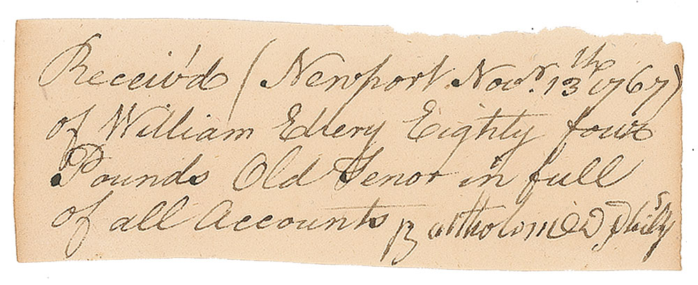 Signer of the Declaration of Independence from Rhode Island (1727-1820). Third-person ADS, signed within the text, “William Ellery,” one page, 3.75 x 1.25, November 13, 1767. A short handwritten receipt by Ellery, in full: "Received (Newport Nov. 13th 1767) of William Ellery Eighty four Pounds Old Tenor in full of all accounts, Bartholomew Phisiy." In fine condition.