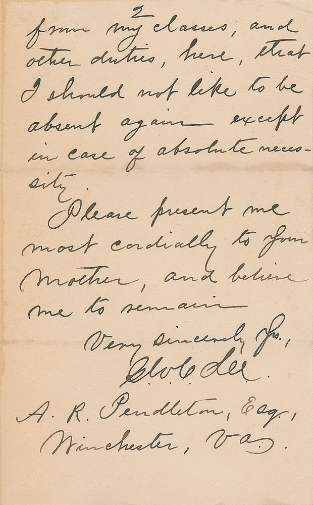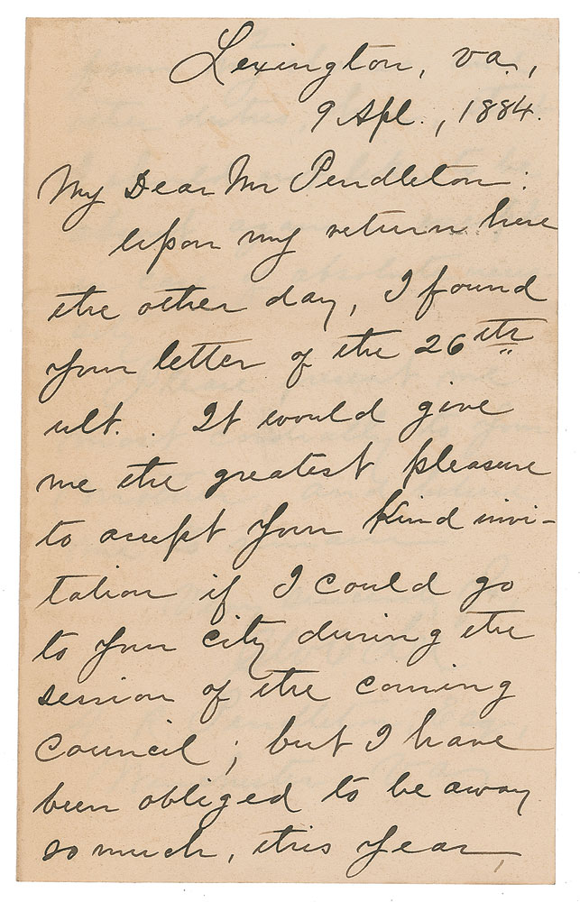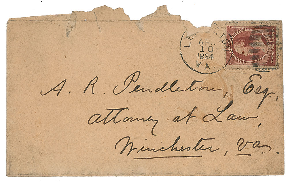 Eldest son of Robert E. Lee, who served as a Confederate general and aide-de-camp to Jefferson Davis (1832-1913). ALS signed “G. W. C. Lee,” two pages on two adjoining sheets, 5 x 8, September 9, 1884. Letter to family friend A. R. Pendleton in Winchester, Virginia, in part: "Upon my return here the other day, I found your letter of the 26th ult. It would give me the greatest pleasure to accept your kind invitation if I could go to your city during the session of the coming council; but I have been obliged to be away so much, this year, from my classes, and other duties, here, that I should not like to be absent again except in case of absolute necessity." In fine condition. Accompanied by the original mailing envelope, addressed in Lee's hand.