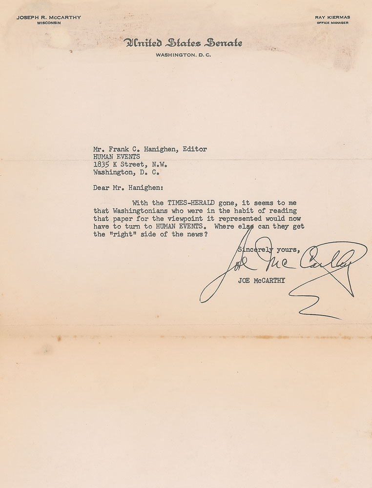 TLS signed “Joe McCarthy,” one page, 8 x 10.5, United States Senate letterhead, no date but circa 1954. Letter to Frank C. Hanighen, editor of Human Events. in full: “With the Times-Herald gone, it seems to me that Washingtonians who were in the habit of reading that paper for the viewpoint it represented would now have to turn to Human Events. Where else can they get the 'right' side of the news?” In very good condition, with light creasing, an extra horizontal fold, and light show-through at the top from old adhesive residue on the back.
