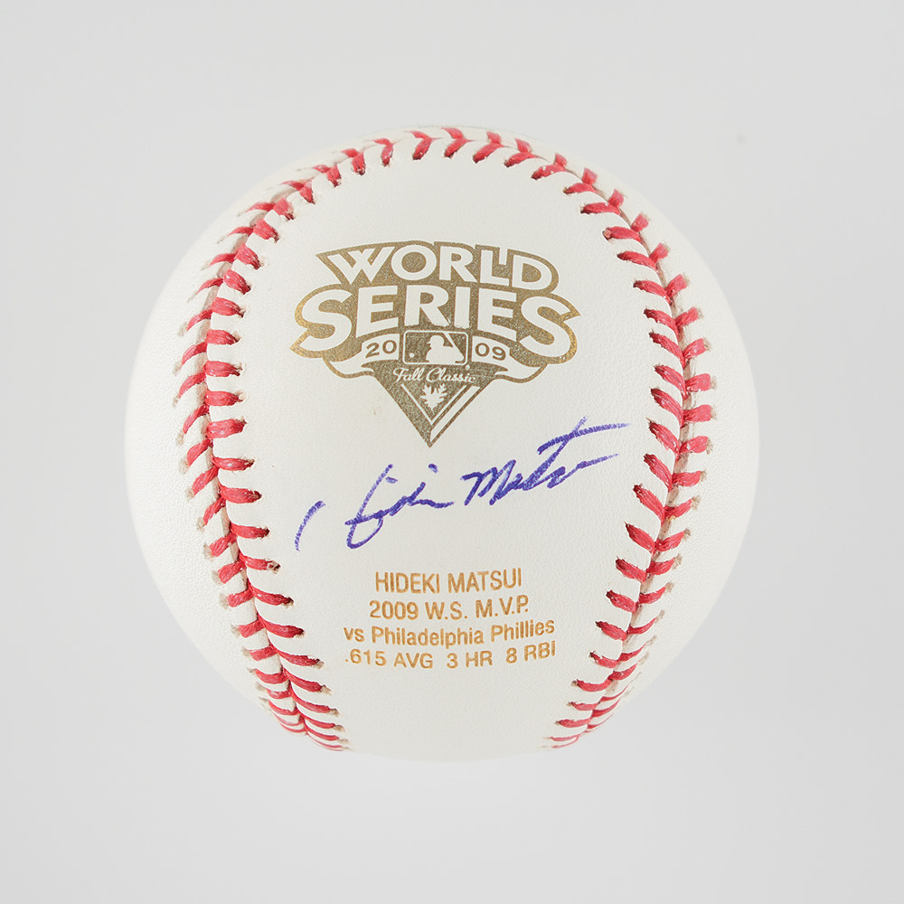 Official Rawlings 2009 World Series League baseball laser-engraved with Matsui's MVP-winning statistics, signed in blue ballpoint on a side panel by Matsui. In very fine condition.