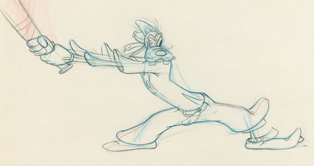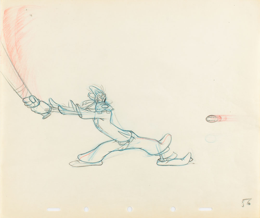 (Walt Disney Studios, 1942) Excellent original production drawing of Goofy from How to Play Baseball, which shows Goofy mid-swing with one eye on an incoming fastball. Accomplished in graphite and colored pencil on untrimmed 12 x 10 animation paper, marked in the lower right corner, "56." Goofy with bat measures 9 x 7.5. In fine condition.