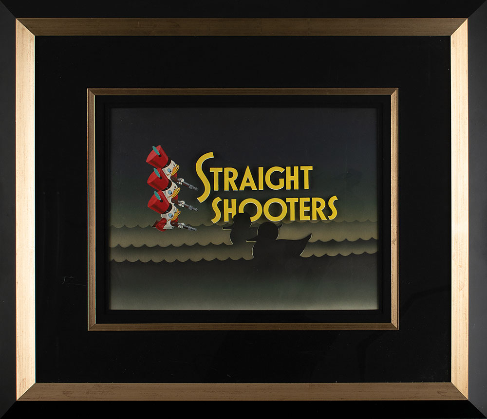 (Walt Disney Studios, 1947) Amazing original key master background title card for the Donald Duck short Straight Shooters, which shows the title in bright yellow lettering against a matching hand-painted production background of Huey, Dewey, and Louie aiming their rifles at shooting gallery ducks. The title measures 8 x 4, with a mat opening of 15 x 11.5. Impressively cloth-matted and framed to an overall size of 27 x 23.5. In fine condition.