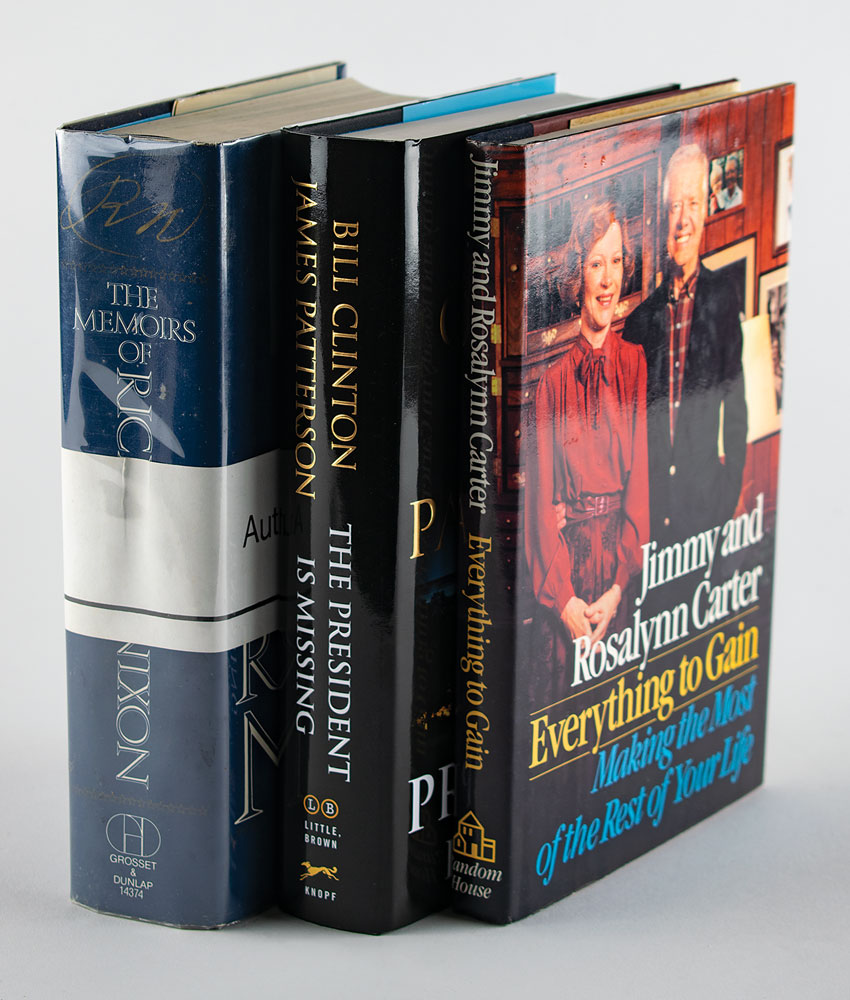 Three books signed by presidents, all hardcover with dust jackets, including: Richard Nixon (The Memoirs of Richard Nixon); Jimmy and Rosalynn Carter (Everything to Gain); and Bill Clinton (The President Is Missing, also signed by co-author James Patterson). In overall fine condition. Accompanied by an 'Event Guidelines' slip from the Clinton/Patterson book signing event.