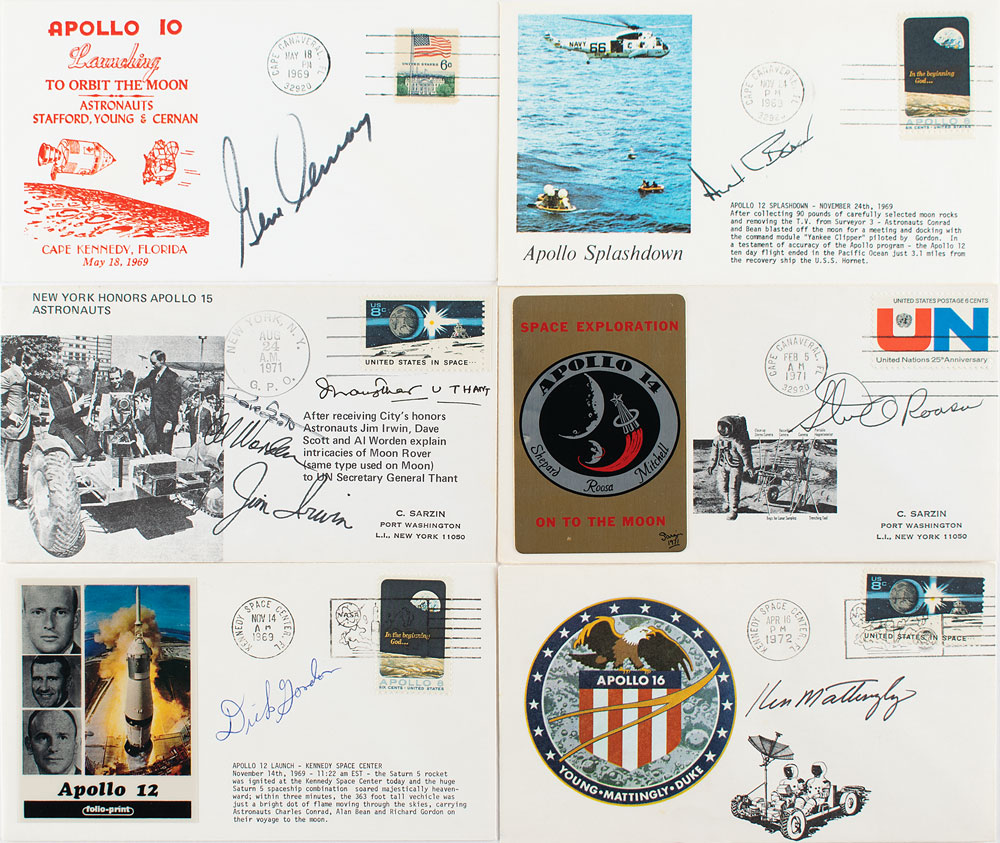Six commemorative covers signed in black felt tip by Apollo astronauts, including: Alan Bean, Dave Scott and Al Worden (also signed by U. Thant, and bearing an autopen signature of Jim Irwin), Gene Cernan, Stu Roosa, Dick Gordon, and Ken Mattingly. In overall fine condition.