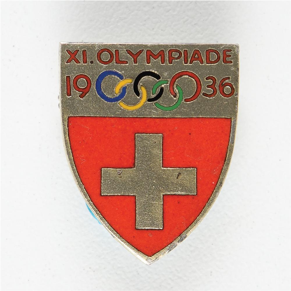Official Swiss National Olympic Committee badge issued for the Berlin 1936 Summer Olympics, 4 gm, 20 mm x 25 mm, with upper border bearing the Olympic rings with red text, “XI. Olympiade, 1936,” and the lower section featuring the Switzerland coat of arms. Reverse is marked by the manufacturer: “Huguenin, Locle.”