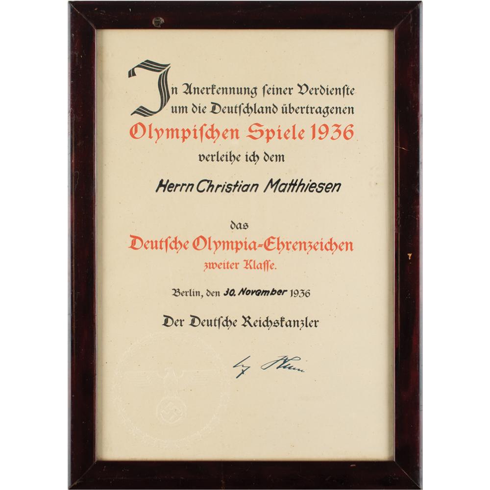 Official German Olympic Medal certificate issued after the Berlin 1936 Summer Olympics, one page, 7.75 x 11.25, printed in German, in full (translated): “In recognition of his services to the 1936 Olympic Games broadcast to Germany, I award Mr. Christian Matthiesen the German Olympic medal of honor second class. Berlin, November 30, 1936, The German Reichstanzler.” Lower portion bears a printed signature of Adolf Hitler, with lower left embossed with the Reichsadler of Nazi Germany. Framed to a slightly larger size. In fine condition, with some light spotting.