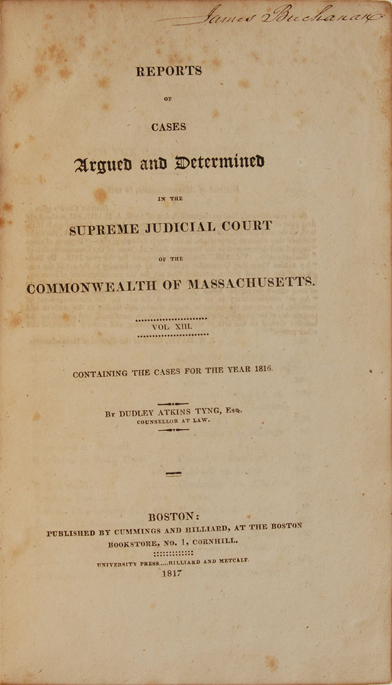 Signed book: Reports of Cases Argued and Determined in the Supreme Judicial Court of the Commonwealth of Massachusetts, Vol. XIII. Boston: Cummings and Hilliard, 1817. Hardcover, 6.25 x 9.5, 579 pages. Signed on the title page in ink with his ownership signature, "James Buchanan." Autographic condition: very good to fine condition, with scattered light foxing. Book condition: VG-/None, with light scattered foxing throughout, repairs to boards, and some scuffing and flaking to leather.