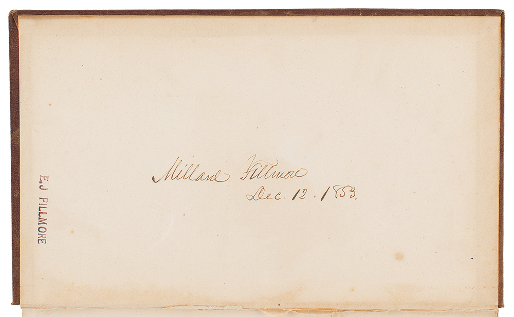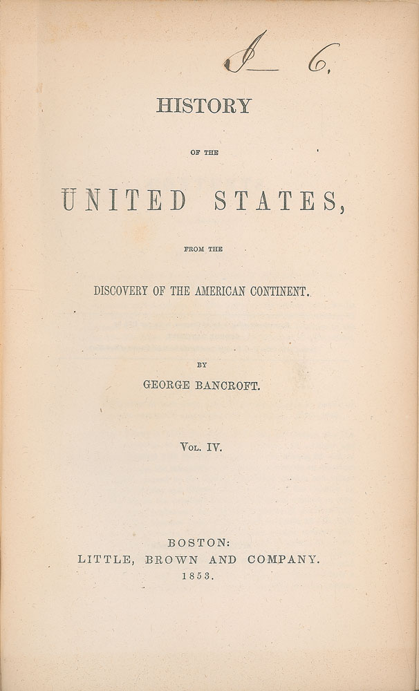Signed book: Bancroft’s History of the United States, Volume IV. Later printing. Boston: Little, Brown and Company, 1853. Hardcover, 6.25 x 9.5, 462 pages. Front pastedown bears a vertical ownership signature, “Millard Fillmore, Dec. 12, 1853.” On the title page Fillmore has penned the book’s location on his library shelf: “I - C.” Fillmore has made several marginal pencil notations throughout the book, writing "Peninsula," "in N.E. of Spain," "Venus," "Geo. Montagu," "now Franklin," "near Pittsburg," "Ticonderoga," and "the Great of Prussia," among other brief notes. Autographic condition: fine, with light edge toning and one small stain. Book condition: VG/None, with sunning to spine and light rubbing to boards.