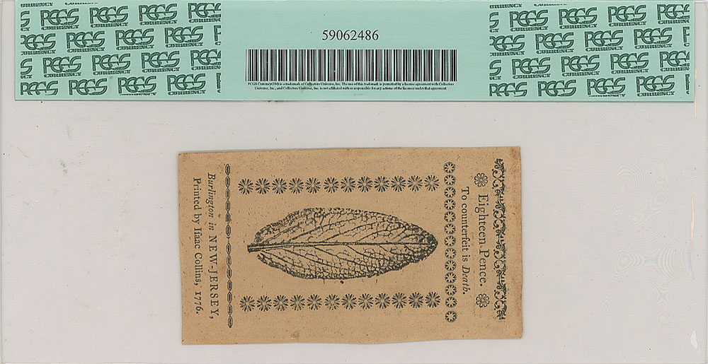 Revolutionary War-era colonial currency from New Jersey in the amount of 18 pence (NJ-176, March 25, 1776, Serial #48450, Plate B), graded PCGS About New 53. The obverse is signed in ink, "Rob't Smith," "Jno: Johnston," and "John Smyth," and the reverse boasts the ominous warning: "To counterfeit is Death."
