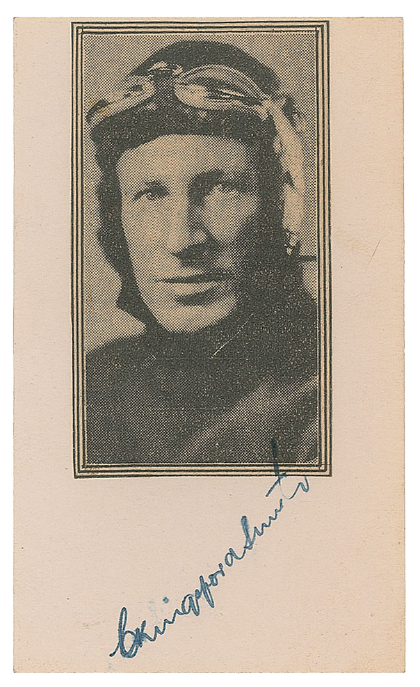 Australian aviator (1897-1935) who made the first trans-Pacific flight from the United States to Australia. After setting off from Allahabad, India on the second leg of an attempt at the England-Australia record in 1935, his plane went missing over the Bay of Bengal and he was presumed dead. Vintage fountain pen signature, "C. Kingsford Smith,” on an off-white 3 x 5 card bearing an affixed newspaper photo; the end of Smith's signature extends onto the image. In fine condition.