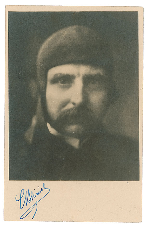 French engineer and aviator (1872-1936) who made the first crossing of a large body of water in a heavier-than-air craft when he flew across the English Channel in 1909. Vintage matte-finish 3.5 x 5.5 close-up postcard photo of the French aviator, signed in the lower border in fountain pen, "L. Bleriot." In fine condition, with light overall silvering.
