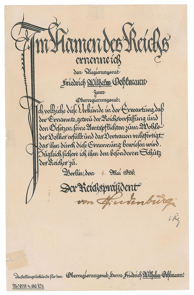 DS in German, signed “von Hindenburg,” one page, 8.25 x 13, March 6, 1926. Untranslated official document boasting a large embossed seal to the lower left. In very good to fine condition, with some creasing, and show-through from old tape on the back of three short edge tears.