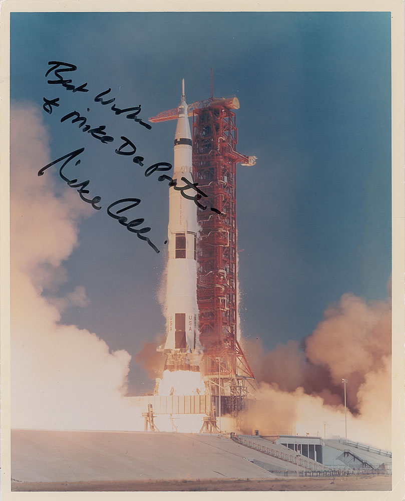 Official color glossy 8 x 10 NASA photo of the historic launch of the Apollo 11 mission, signed and inscribed in black felt tip, "Best wishes to Mike DePonte, Mike Collins.” Reverse bears NASA caption text and "A Kodak Paper" watermarks. In very good to fine condition, with several small creases.