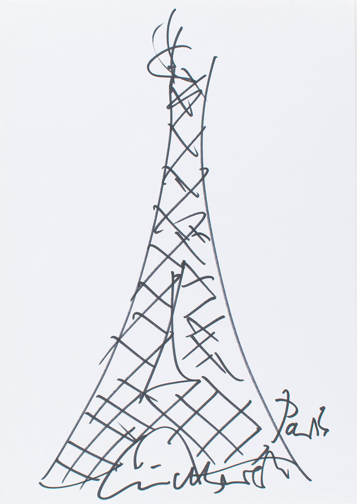 German fashion photographer (1944-2019) whose cover for the January 1990 edition of British Vogue helped usher in the era of supermodels. Original sketch of the Eiffel Tower by Peter Lindbergh, accomplished in black felt tip on a white 8.25 x 11.75 sheet by the photographer, who signs below and adds "Paris." In very fine condition. Accompanied by a photo of Lindbergh taken at the time of the signing.