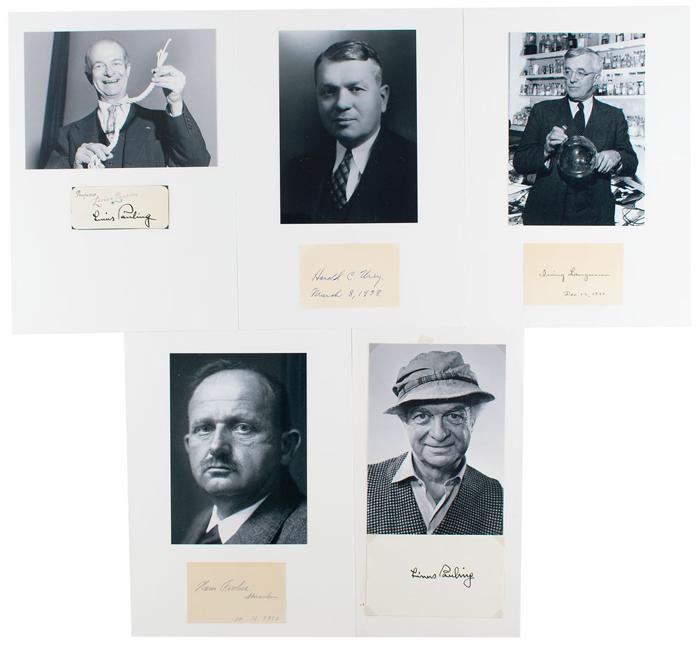 Five ink signatures of four notable recipients of the Nobel Prize in Chemistry on individual off-white cards ranging in size from 3.5 x 2.25 to 5 x 3, including: "Hans Fischer, Munchen, 10. 12. 1930," "Irving Langmuir, Dec. 12, 1932," "Linus Pauling" (2), and "Harold Clayton Urey, March 8, 1938." Each signature is affixed to a larger sheet with a photo of the respective scientist. In overall fine condition.