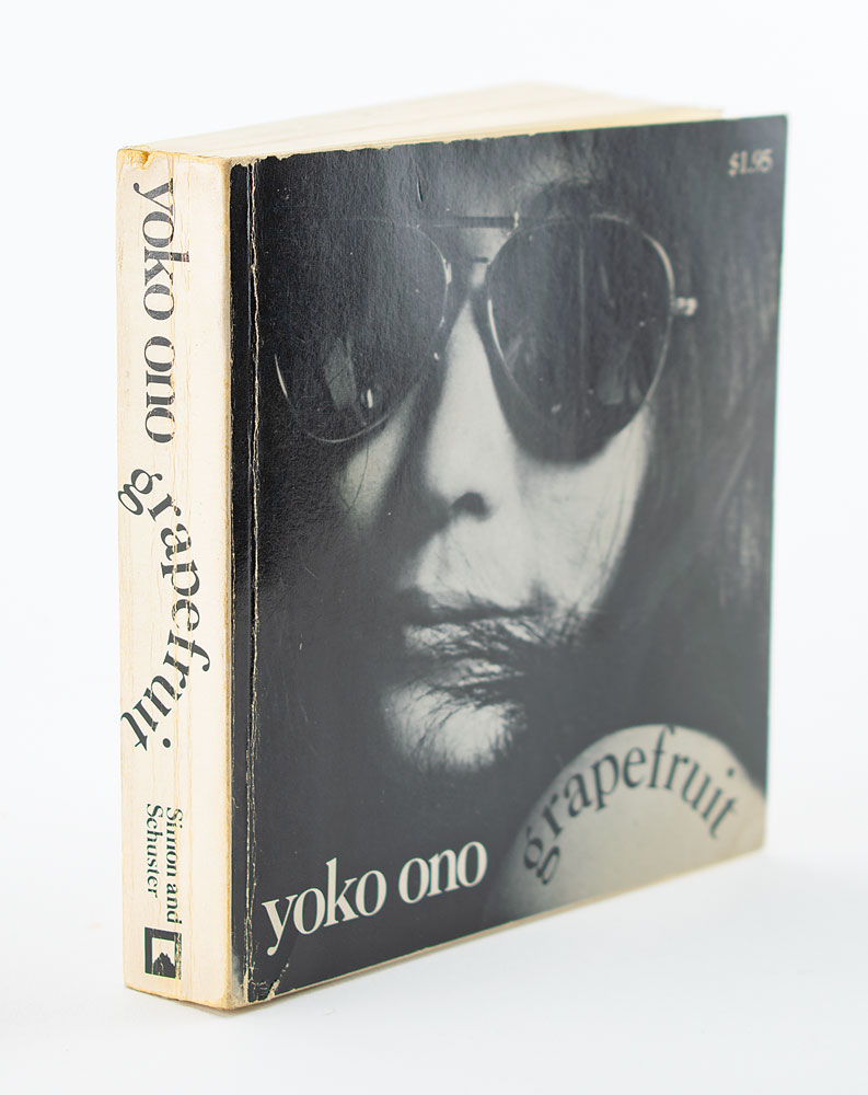 Signed book: Grapefruit. First Touchstone paperback edition. NY: Touchstone, 1971. Softcover, 5.25 x 5.25. Signed and inscribed on the first free end page in black felt tip, "To Joe, Love and Peace, Yoko Ono" and "John Lennon, 1971." Lennon adds a classic self-portrait doodle of Yoko and himself under his signature. In fine condition, with light creasing to the spine. A fabulous dual-signed book from John and Yoko.