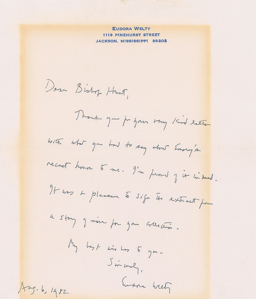 ALS, one page, 6 x 7, personal letterhead, August 6, 1972. Letter to "Bishop Hunt," in part: "Thank you for your very kind letter with what you had to say about Emory's recent honor to me. I'm proud of it indeed. It was a pleasure to sign the extract from a story of mine for you." In fine condition, with a block of light toning.