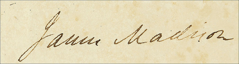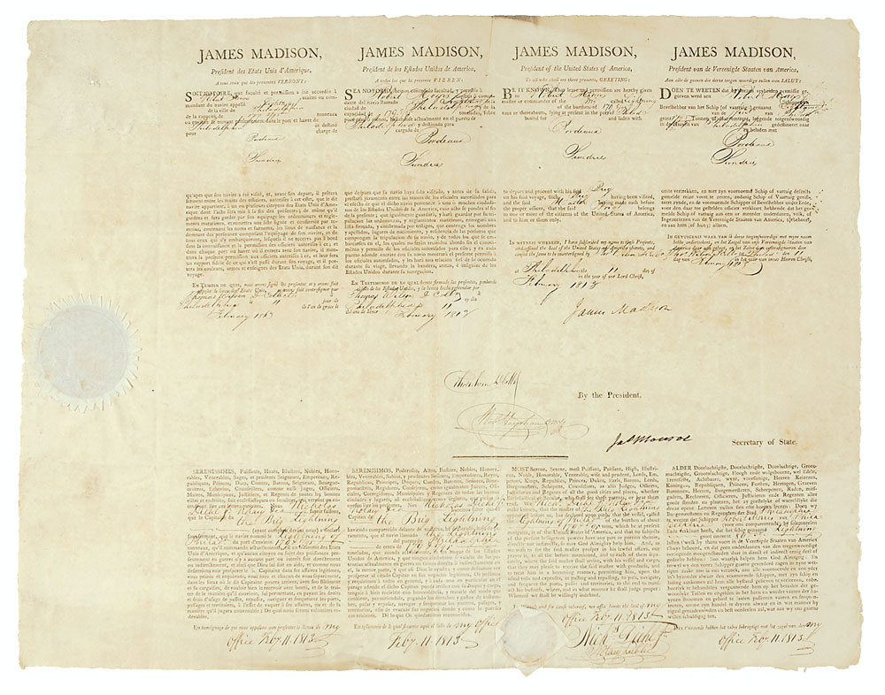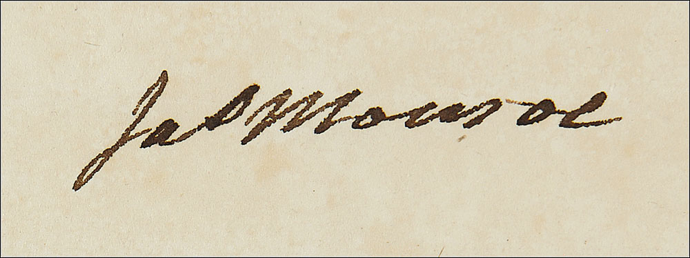 Partly-printed DS, signed “James Madison” as president and “Jas. Monroe” as secretary of state, one page, 21.25 x 16.5, February 11, 1813. A four-language ship’s papers issued to Robert Morris, “master or commander of the Brig called Lightning?lying at present in the port of the Philadelphia bound for Bordeaux and laden with Sundries.” Two embossed paper seals remain intact along the left and bottom edges. Framed to an overall size of 27 x 21. Intersecting storage folds (trivially touching signatures), scattered creasing and wrinkles, and scattered light toning and foxing, otherwise fine condition. An unusually well-preserved example with clear, dark signatures!