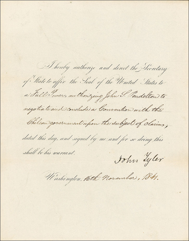Partly-printed DS as president, one page, 8 x 10, November 16, 1841. Tyler orders the Secretary of State to affix the "Seal of the United States to a Full power, authorizing John L. Pendleton to negotiate and conclude a Convention with the Chilean government upon the subject of claims." Neatly signed at the conclusion by Tyler. Document is archivally sleeved in acid-free Mylar. In fine condition.