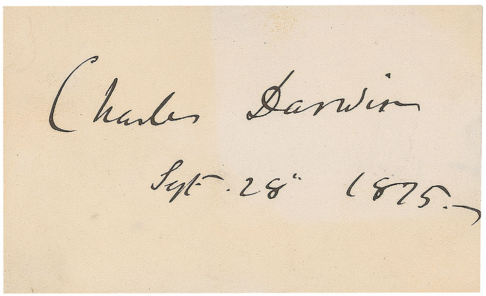 Bold ink signature, "Charles Darwin, Sept. 28, 1875," on an off-white 3.5 x 2 slip. In fine condition, with a faint block of toning to the left side and bottom.