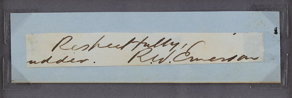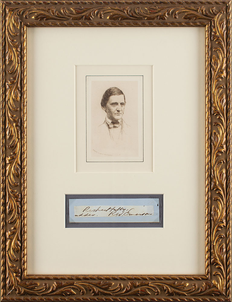 Ink signature, "Respectfully, R. W. Emerson,” on an off-white 3.75 x .5 slip. Nicely corner-mounted, matted, and framed with a portrait to an overall size of 11 x 14.5. In fine condition.