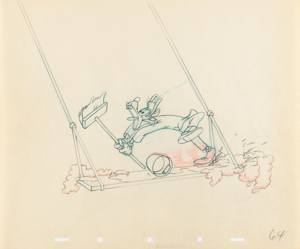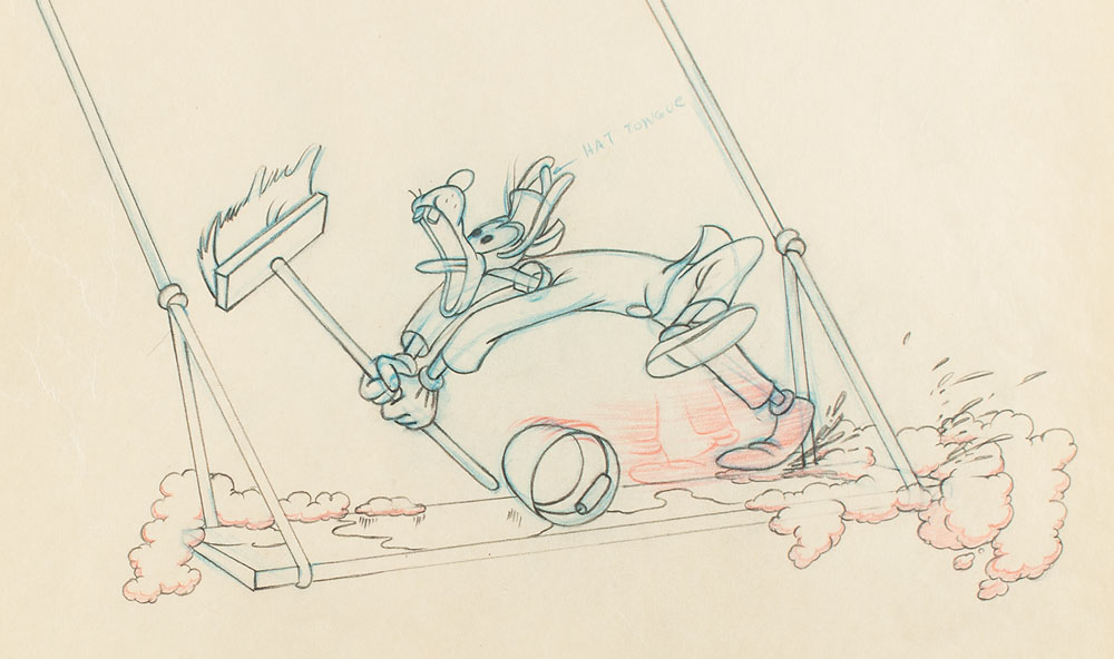 (Walt Disney Studios, 1948) Dramatic original production drawing featuring Goofy from the elephant washing scene in The Big Wash, showing him running on a board with brush in hand as his bucket rolls away. Accomplished in graphite and colored pencil on untrimmed 12 x 10 animation paper, marked "64" in the lower corner. Total image measures 8.5 x 7.25. In fine condition.