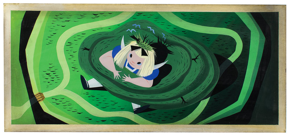 (Walt Disney Studios, 1951) Vibrant original concept storyboard painting by Mary Blair featuring Alice from Alice in Wonderland, which depicts the instantly recognizable title character in her blue dress from an aerial viewpoint, showing her seated in tremendous size after growing high above the canopy of Tulgey Wood. The painting is rendered with an array of lush and verdant greens, while offering an entirely unique perspective and scenario not found in the final Disney product. Accomplished in tempera and watercolor on a 19.25 x 8.75 illustration board. In fine condition, with tack holes to corners. A beautiful panorama storyboard from the classic Disney fantasy.