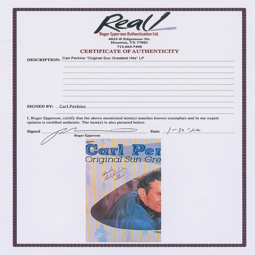 Original Sun Greatest Hits album signed on the front cover in red ballpoint, "Thanks, Carl Perkins, 86." In fine condition. The record is included. Accompanied by a full letter of authenticity from REAL.