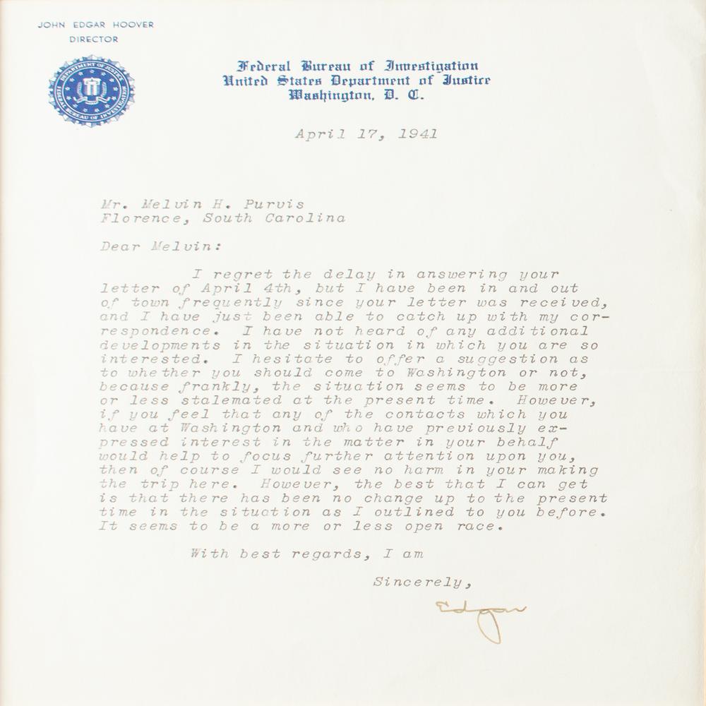Two items signed by the FBI men who famously did not get along: a TLS from Hoover to Purvis, signed "Edgar," one page, FBI letterhead, April 17, 1941, in part: "I have not heard of any additional developments in the situation in which you are interested. I hesitate to offer a suggestion as to whether you should come to Washington or not…if you feel that any of the contacts which you have at Washington and who have previously expressed interest in the matter in your behalf would help to focus further attention upon you, then of course I would see no harm in your making the trip here," matted with a portrait of Hoover to an overall size of 19.5 x 12.5; and a bank check filled out and signed by Purvis, "Melvin H. Purvis," payable to cash for $583.65, August 5, 1939. In overall fine condition. Accompanied by a full letter of authenticity from JSA for the check, and a certificate of authenticity from JSA for the letter.