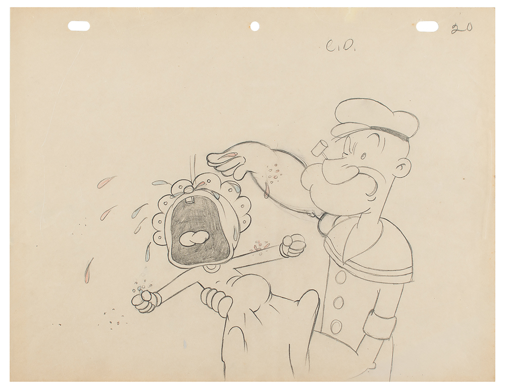 (Fleischer Studios, 1934) Original production drawing featuring Popeye and Swee'Pea from Sock-a-Bye, Baby, showing the spinach-eating strongman attempting to silence the wailing child. Accomplished in graphite on untrimmed 11 x 8.5 animation paper, marked "20" in the upper right corner. Total image measures 6.5 x 6.5. In fine condition. An amusing production drawing that aptly captures the tone of this memorable Popeye short, in which he goes to great lengths in his attempts to get Swee'Pea to go to sleep.