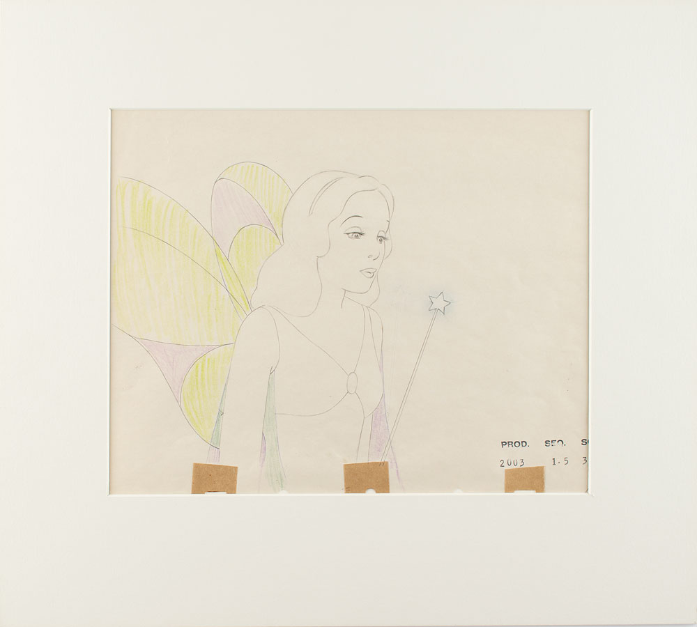 (Walt Disney Studios, 1940) Original production drawing featuring the Blue Fairy from Pinocchio, showing the winged magical being in a great waist-up pose with her wand raised. Accomplished in graphite and colored pencil on animation paper, stamped "Prod 2003, Seq. 1.5, Sc. 3[2]" in the lower right. Image measures 7.5 x 7.5, with a mat opening of 11 x 8.75. Matted to an overall size of 16 x 14.25. In fine condition. A very scarce character from a classic film.