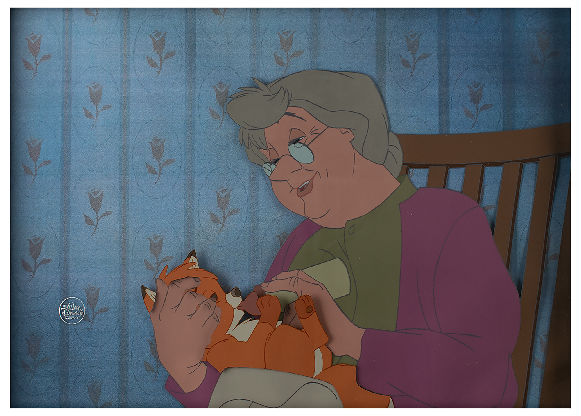 (Walt Disney Studios, 1981) Original production cel featuring Tod and Widow Tweed from The Fox and the Hound, showing the caring widow nursing the baby fox. The cel is placed on a color Disney litho background. Image measures 11 x 8, with a mat opening of 15 x 10. Nicely framed to an overall size of 23.5 x 17.5 The piece has the silver Walt Disney Company seal to lower left. In fine condition. Accompanied by a certificate of authenticity from the Walt Disney Company. A warm and impressively displayed piece from a popular Disney film.