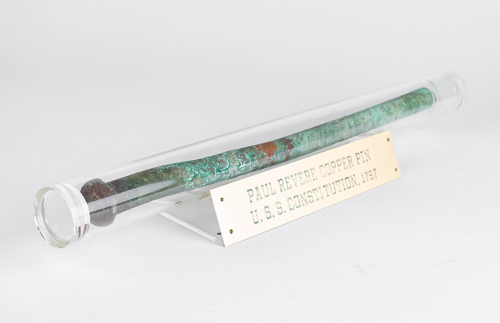 Solid copper spike or rod (14-7/8" x 7/8" with 1-1/4" diameter head) made by Paul Revere for the USS Frigate Constitution ('Old Ironsides'), 1795-1797. Revere held the contact for supplying the copper bolts, rods, spikes, and other fittings, as well as the copper sheathing on the hull, for which he received $3,820.33. The 7/8" copper rods were primarily used below the ship’s water line to fasten ribs to keel and floor timbers to ribs.