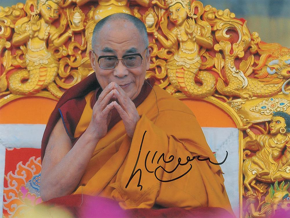 Color glossy 10.5 x 8 photo of the Dalai Lama seated peacefully in an ornate golden chair, signed in Tibetan in black felt tip. In fine condition, with a light bend along the upper right edge.