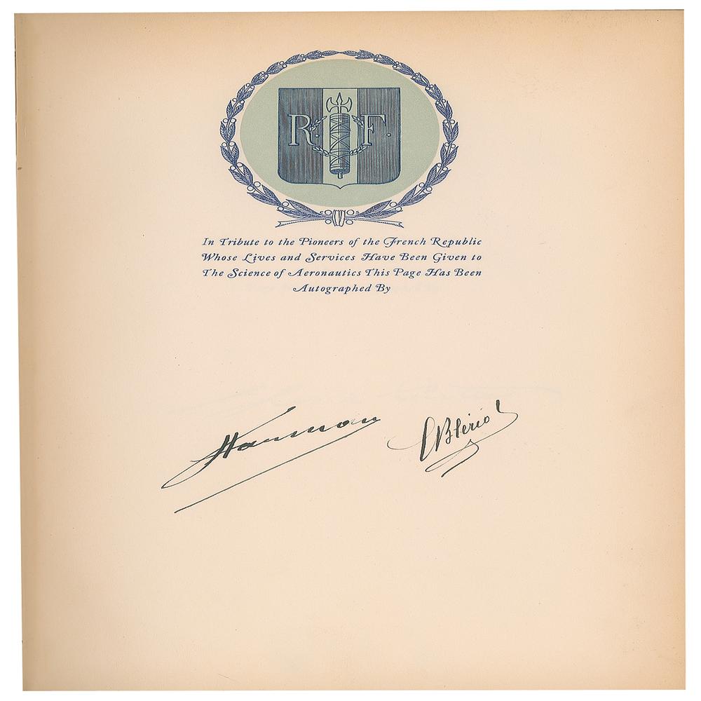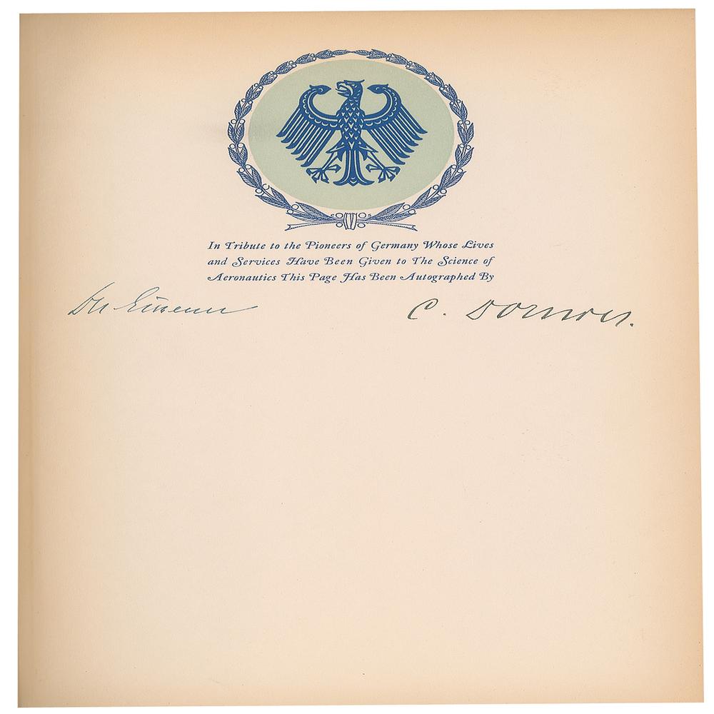 Signed book: The World in the Air by Francis Trevelyan Miller. First edition, limited issue, numbered 25/500. NY: G. P. Putnam’s Sons, 1930. Hardcover, 8.5 x 11.5, 315 pages. Signed by the author and publisher on the colophon, as well as by seven noted pioneers of aeronautics on the opening presentation pages, including: Glenn Curtiss, who made the first public flight in America; Dr. Hugo Eckener, commander of the 'Graf Zeppelin,' who made the first airship flight around the world; Louis Bleriot, who made the first airplane flight across the English Channel; Dr. Claude Dornier, German designer and builder of multi-engined aircraft; Henri Farman, who made the first distance flight in Europe; Major G. H. Scott, commander of the first Trans-Atlantic voyage in an airship in 1919; and Lieut. Arthur Whitten Brown, co-commander of the first nonstop airplane flight across the Atlantic in 1919. In very good to fine condition, with wear and staining to the covers, and heavy toning and cracking to the spine; interior pages are clean and unaffected.