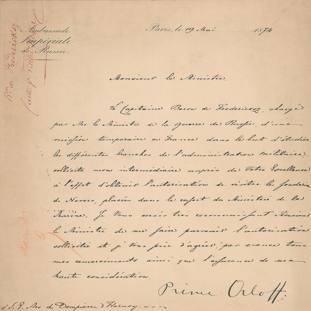 Russian diplomat (1827-1885) who served as ambassador to Belgium and to the Austro-Hungarian Empire. LS in French, signed “Prince Orloff,” one page, 8 x 10.25, Ambassade Imperiale de Russie letterhead, May 19, 1874. Letter concerning a Russian on a mission in France to study their branches of military administration, requesting authorization for him to visit the foundry in Nevers. In fine condition, with light toning and soiling.