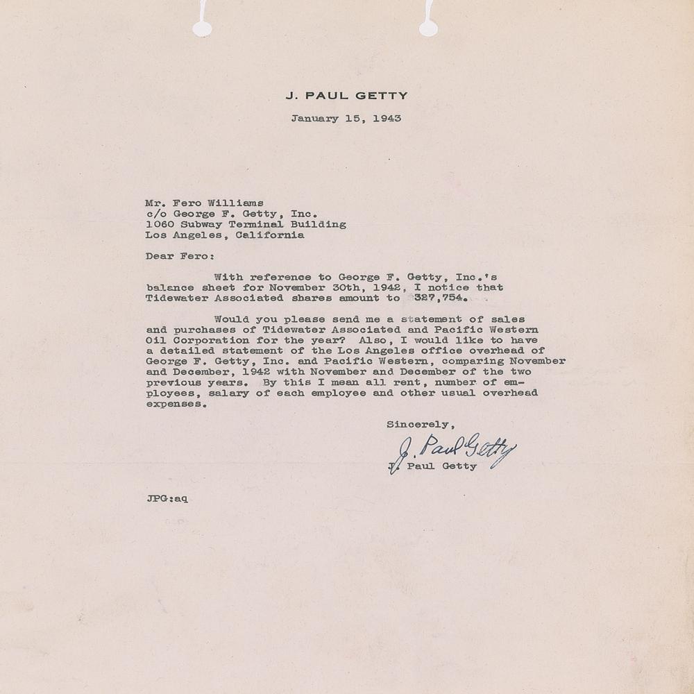 TLS, one page, 8.5 x 11, personal letterhead, January 15, 1943. Letter to Fero Williams of George F. Getty, Inc., requesting financial reports for Tidewater Associated, Pacific Western Oil Corporation, and George F. Getty, Inc. In fine condition, with two torn file holes at the top.